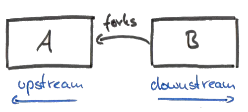 - A는 원본(upstream), B는 A의 fork(downstream)